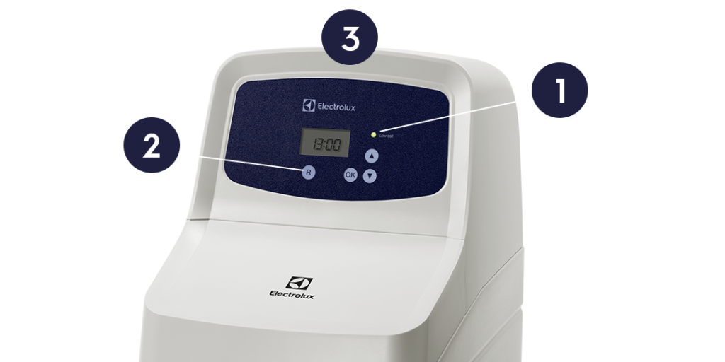 Vybavený alarmom nízkej hladiny soli (1), ktorý informuje používateľa, keď je potrebné doplniť tabletovú soľ do zariadenia.