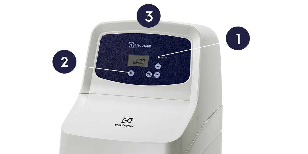 Moderné ovládanie prevádzky zariadenia na základe objemovej logiky zaisťuje maximálnu účinnosť s minimálnou spotrebou soli a vody na regeneráciu (2).